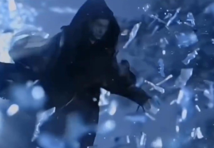 男主的出场的画面也看得人满头问号,先是天空中出现一个巨大的圆形,接着圆形爆开,男主从冰碴子中走出,慢动作+大特写看的人尴尬不已,导演你要不要看看自己在拍什么?